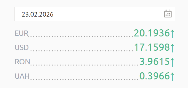 Astăzi, 23 februarie, un euro este cotat la 20,19 lei, în creștere cu aproape doi bani față de cursul valutar din perioada 20-22 februarie.