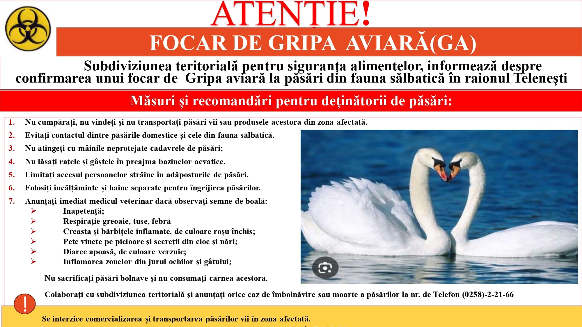 Autoritățile din raionul Telenești au declarat situație excepțională la nivel local, după confirmarea unui focar de gripă aviară în extravilanul localității Brînzenii Noi, pe perimetrul râului Răut. Virusul a fost depistat la păsări sălbatice, mai exact la lebede.