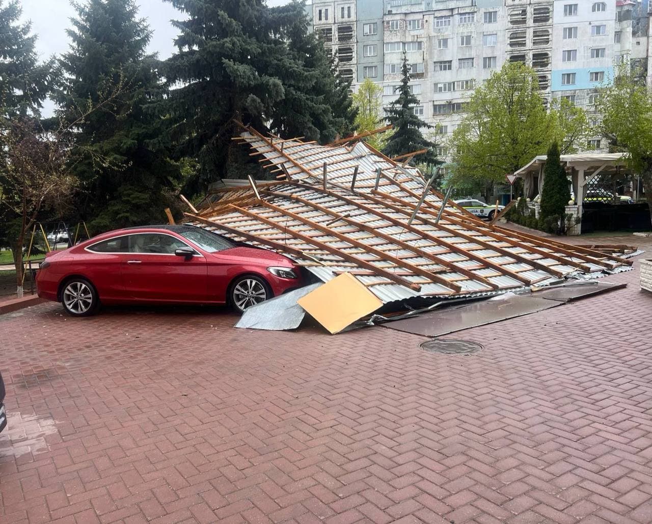 Iar, pe o stradă din Strășeni, în urma intensificării vântului, mai multe foi de ardezie de pe acoperișul unui bloc locativ au căzut peste automobilele din apropiere.