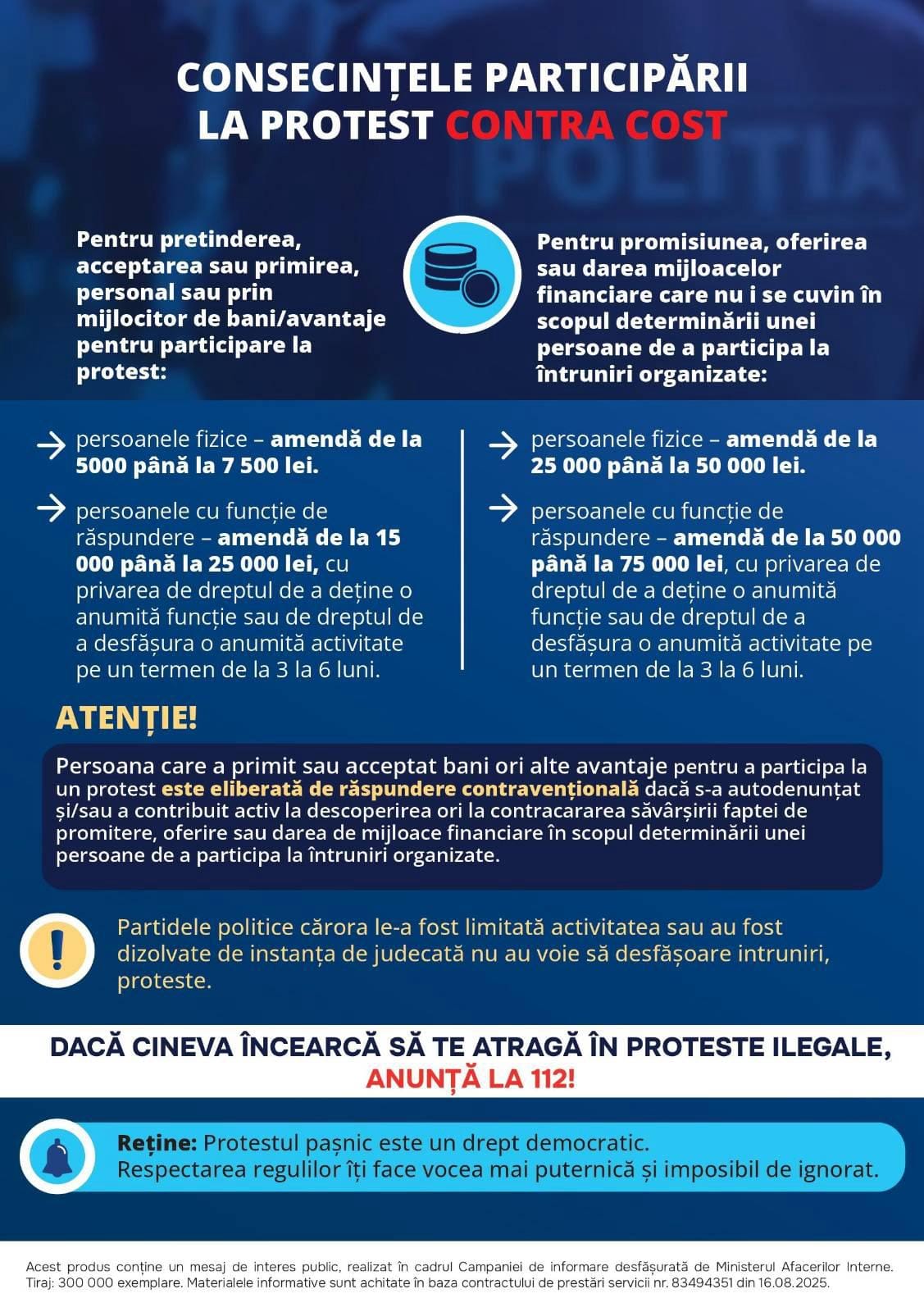 Amintim că persoanele care pretind, acceptă sau primesc bani/avantaje pentru participare la protest riscă amenzi cuprinse între 5.000 și 25.000 de lei, iar organizatorii sau finanțatorii pot primi sancțiuni de la 25.000 de lei până la 75.000 de lei.