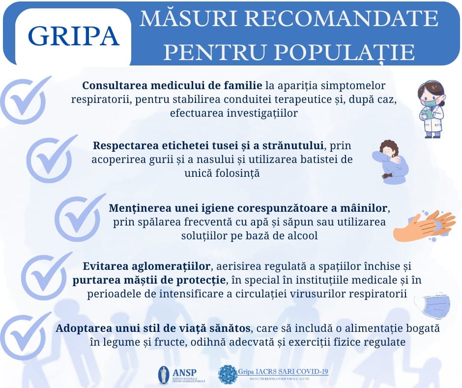 În acest context, ANSP recomandă populației să respecte în continuare măsurile de protecție pentru prevenirea răspândirii infecțiilor respiratorii. Printre acestea se numără păstrarea distanței sociale, evitarea locurilor aglomerate, respectarea regulilor de igienă a mâinilor și a igienei respiratorii, aerisirea frecventă a spațiilor închise, purtarea măștilor în instituțiile medicale și adresarea la medicul de familie la apariția primelor simptome.