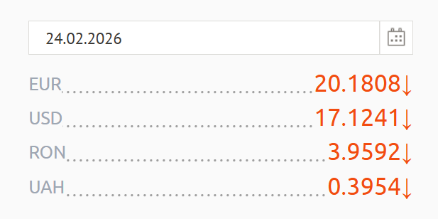 Potrivit datelor Băncii Naționale a Moldovei (BNM), astăzi, 24 februarie, un euro este cotat la 20,18 lei, în scădere cu peste un ban față de cursul valutar din 23 februarie.