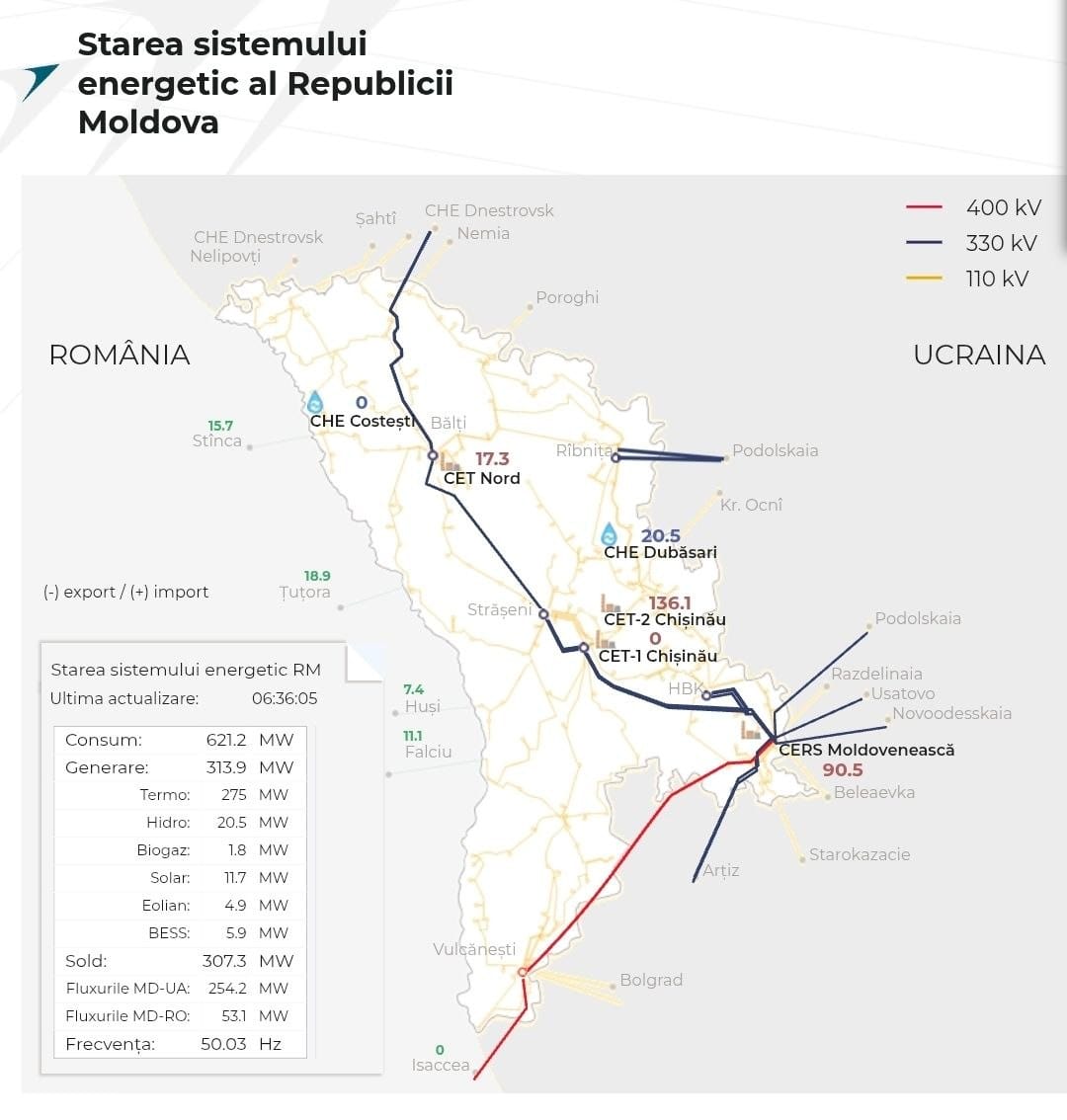Ministerul Energiei anunță că pentru menținerea alimentării cu energie electrică a Republicii Moldova, pe parcursul nopții, operatorul sistemului electroenergetic Moldelectrica, în coordonare cu operatorii sistemelor de transport din România și Ucraina, au pus în funcțiune rute alternative de alimentare, inclusiv cele 4 linii de interconexiune de 110kV dintre România și R. Moldova.