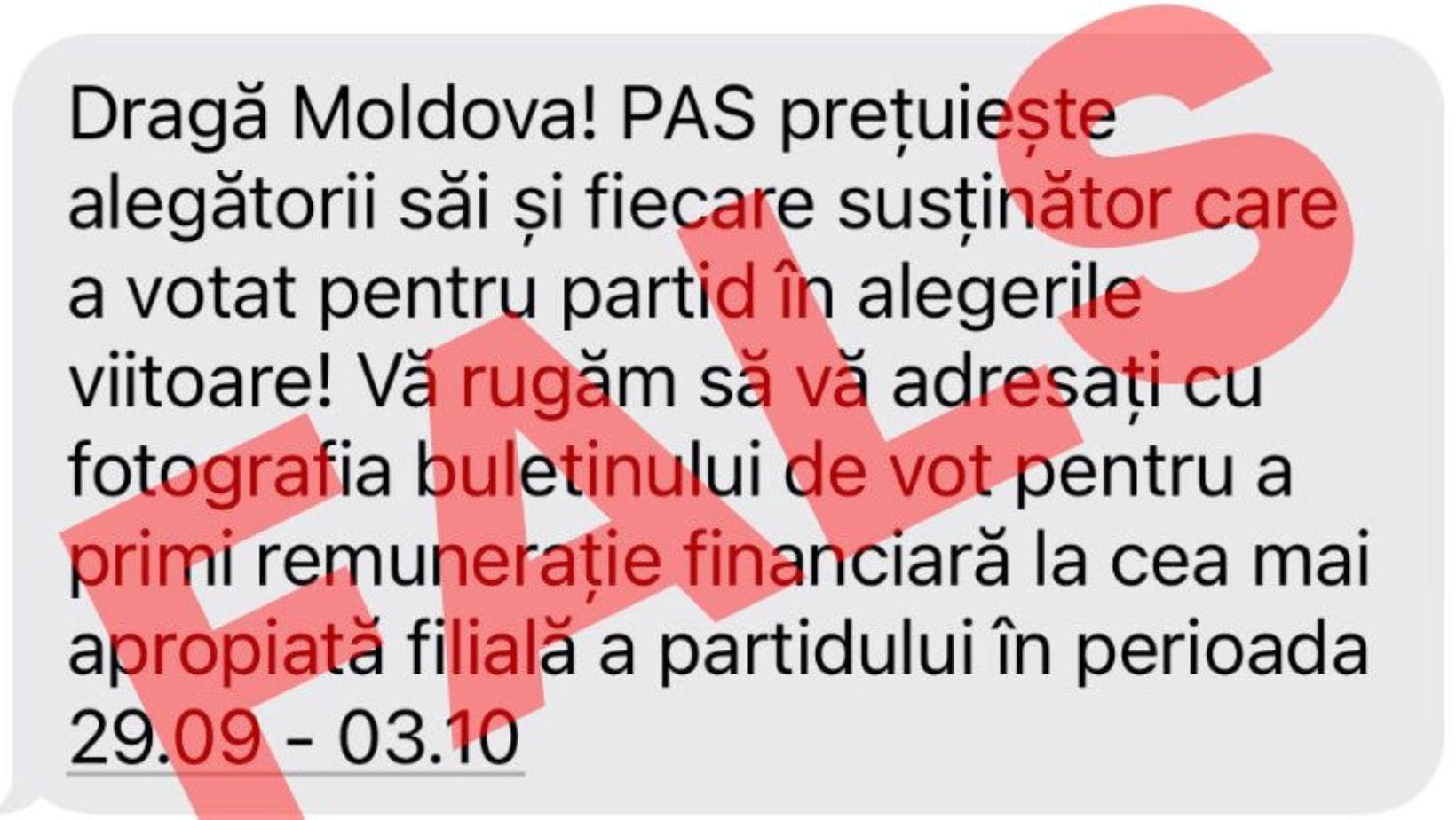 Săptămâna trecută, mai mulți cetățeni au primit SMS-uri pretinse a fi expediate de Partidul Acțiune și Solidaritate (PAS), în care li se promiteau „remunerații financiare” pentru votul la alegerile parlamentare. Atunci, formațiunea a atenționat că mesajele sunt expediate de pe un număr de telefon clonat, care imită numărul oficial al PAS.