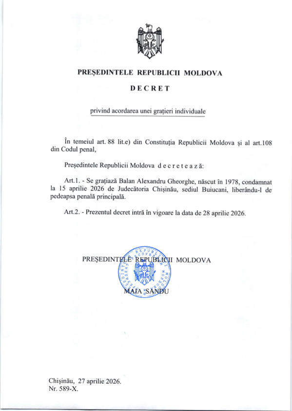 Președinta Republicii Moldova, Maia Sandu, a semnat astăzi, 28 aprilie 2026, decretul de grațiere individuală a lui Alexandru Gheorghe Bălan, fost director adjunct al Serviciului de Informații și Securitate (SIS). Documentul, emis în temeiul articolului 88 din Constituție, anulează executarea pedepsei principale stabilite prin sentința Judecătoriei Chișinău din 15 aprilie 2026.