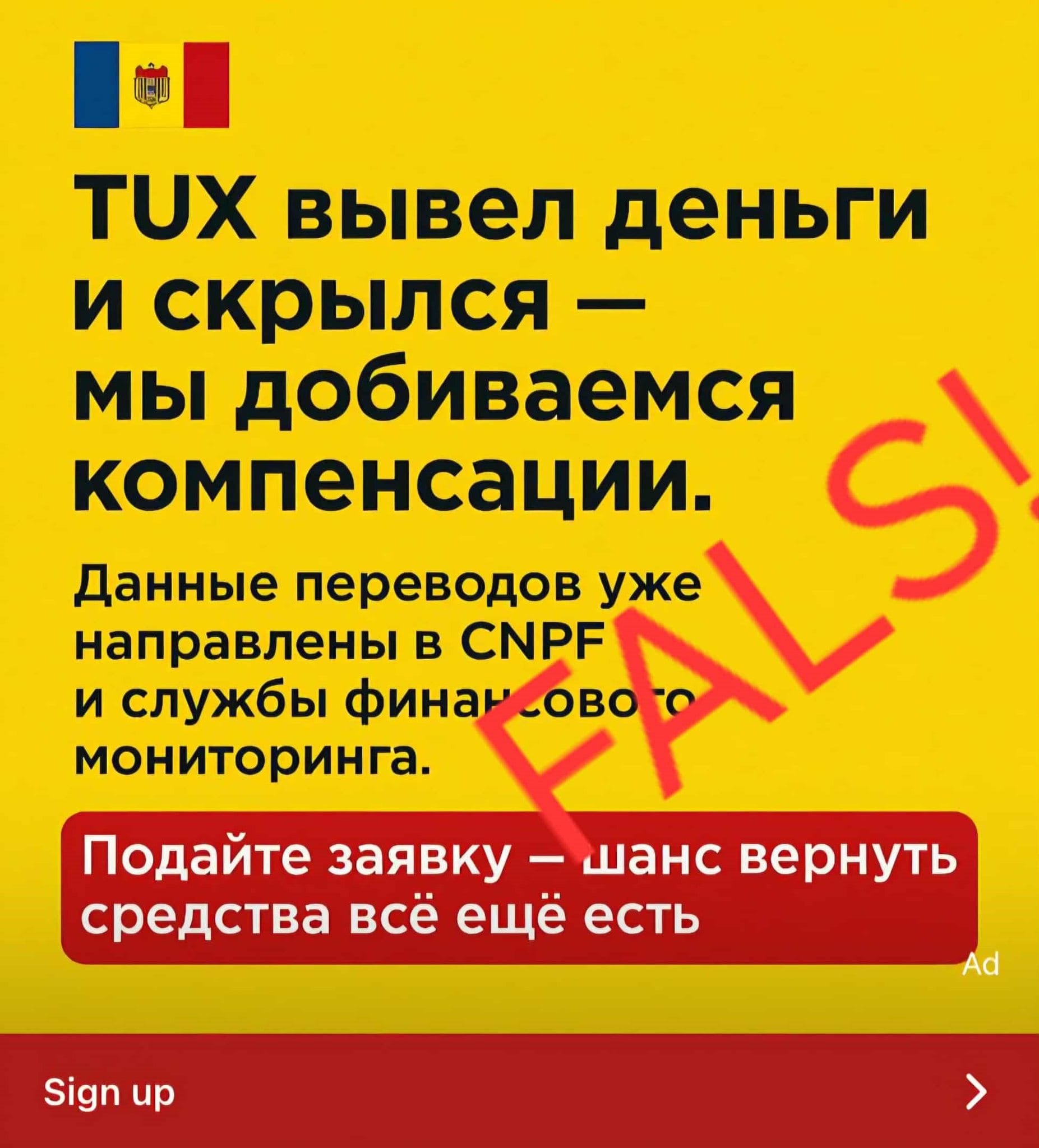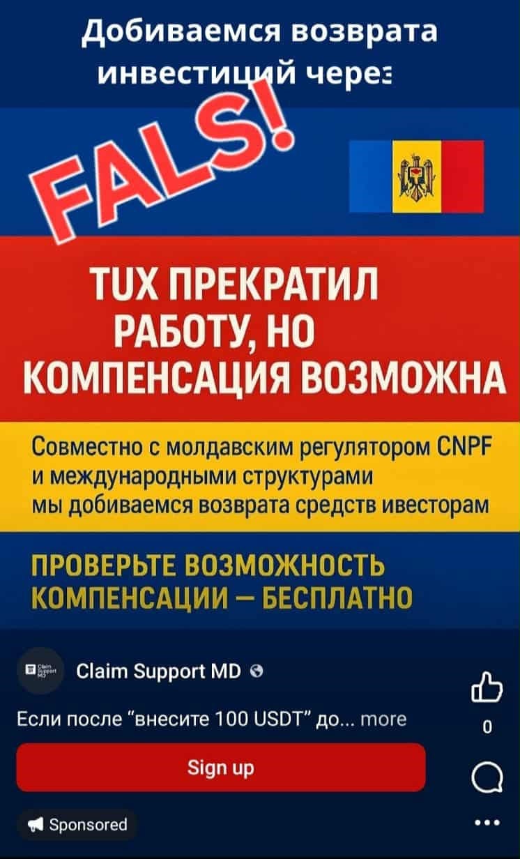 Pe rețelele de sociale au apărut anunțuri precum că persoanele care au investit în platforma TUX își pot recupera banii și că anumite structuri internaționale ar colabora cu Comisia Națională a Pieței Financiare (CNPF) în acest sens. CNPF a venit cu o reacție în care a atenționat că informația este falsă.