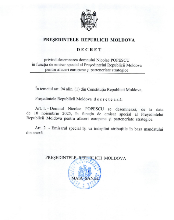 Fostul ministru al Afacerilor Externe și actual deputat al partidului de guvernare, Nicu Popescu, a fost numit în funcția de emisar special pentru afaceri europene și parteneriate strategice. Decretul în acest sens a fost semnat astăzi, 31 octombrie 2025, de președinta țării Maia Sandu.