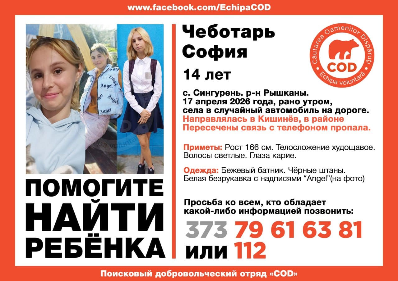 „La ora 08:30, mama a vorbit cu Sofia la telefon. Copila a spus că se află în Orhei, în mașină, iar telefonul avea aproximativ 80% baterie. La scurt timp după, când mama a încercat să o contacteze din nou, telefonul era deja închis. Poliția a fost anunțată”, a scris o internaută pe Facebook, mesajul fiind publicat cu acordul mamei.