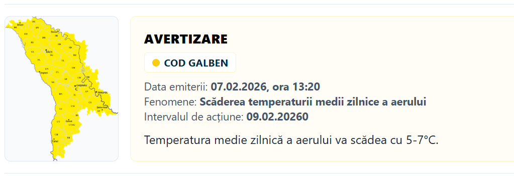 Serviciul Hidrometeorologic de Stat (SHS) a emis încă un cod galben, de această dată - de scădere a temperaturii medii zilnice a aerului. Avertismentul se va aplica pe 9 februarie, pe tot teritoriul țării.