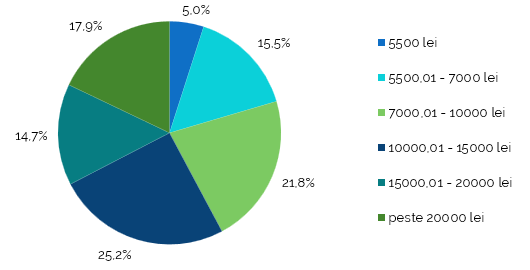 Cele mai mici salarii se regăsesc în comerț, servicii, agricultură și în sectorul public - domenii în care muncesc sute de mii de oameni. Datele BNS mai arată că aproximativ 135.000 de angajați câștigă între 7.000 și 10.000 de lei pe lună, iar aproape 30% dintre salariați, adică circa 192.000 de persoane, au venituri cuprinse între 10.000 și 15.000 de lei.