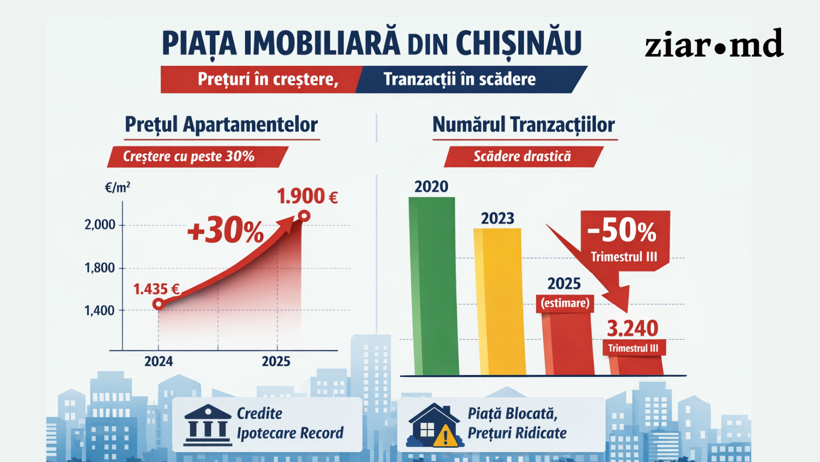 Piața imobiliară din Republica Moldova traversează o perioadă de dezechilibru fără precedent. Prețurile apartamentelor din Chișinău au crescut cu peste 30% într-un singur an, atingând pragul de aproximativ 1 .900 de euro pe metru pătrat, în timp ce numărul tranzacțiilor continuă să se prăbușească, marcând cel mai scăzut nivel din ultimii 15 ani.