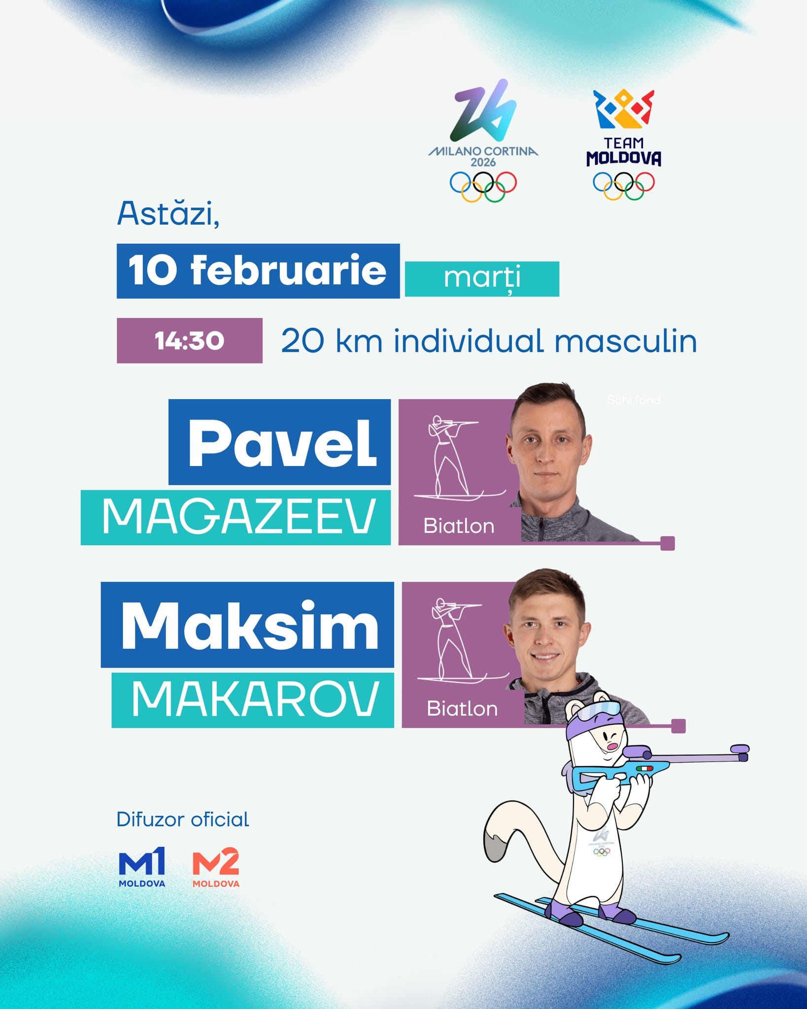 Primii sportivi care reprezintă R. Moldova la Jocurile Olimpice de iarnă de la Milano-Cortina d’Ampezzo vor debuta astăzi în cadrul evenimentului. Este vorba despre biatloniștii Maxim Makarov și Pavel Magazeev, care vor concura în proba de biatlon individual masculin, pe distanța de 20 de kilometri.
