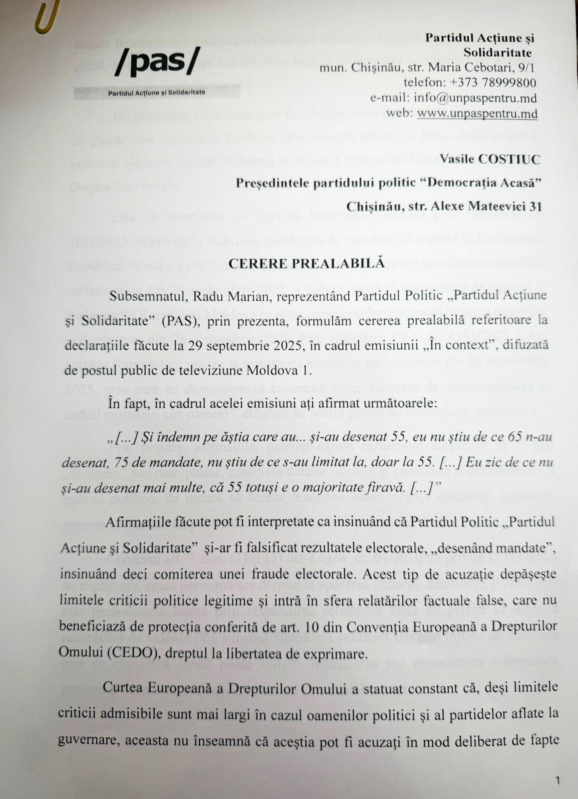 Deputatul PAS, Radu Marian, îi cere liderului formațiunii „Democrația Acasă”, Vasile Costiuc, să dezmintă o declarație făcută în cadrul unei emisiuni de la postul public de televiziune, precum că „PAS și-ar fi „desenat” și ar fi falsificat rezultatul alegerilor”. Marian spune că a depus o cerere prealabilă în acest sens, iar Costiuc are la dispoziție 15 zile pentru a-și prezenta public scuzele. Dacă nu o va face, membrul partidului de guvernare se va adresa în instanța de judecată.
