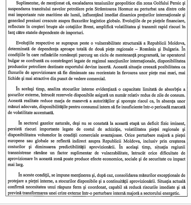 „Ținând cont de faptul ca R. Moldova se aprovizionează în mare parte cu combustibili din Romania, aceasta fiind și cea mai scurtă rută logistică, a fost discutată cu Cabinetul de Miniștri de la București menținerea livrărilor constante a cantităților zilnice de carburanți”, se spune într-un comentariu făcut pentru Europa Liberă de Ministerului Energiei, pe 24 martie, cu câteva ore înainte să fie aplicate restricțiile românești, printr-o Ordonanță de urgență.