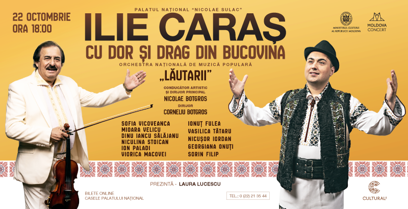 Potrivit Moldova-Concert, în seara zilei de 22 octombrie, orchestra „Lăutarii” va susține un concert la Palatul Național „Nicolae Sulac”, alături de Ilie Caraș și alți interpreți.