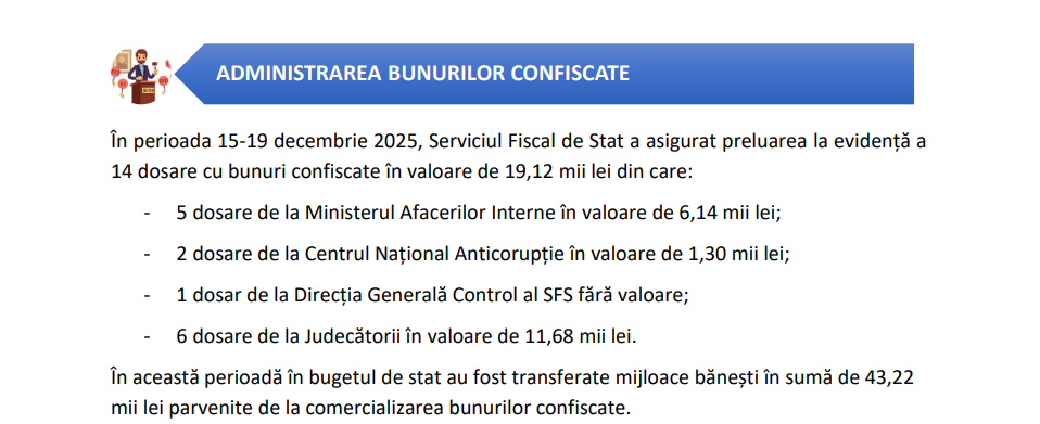 De asemenea, pe parcursul săptămânii precedente, autoritatea fiscală a preluat în evidență 14 dosare cu bunuri confiscate. Din comercializarea acestora, la Bugetul de stat au fost transferate mijloace bănești în sumă de peste 43 de mii de lei.