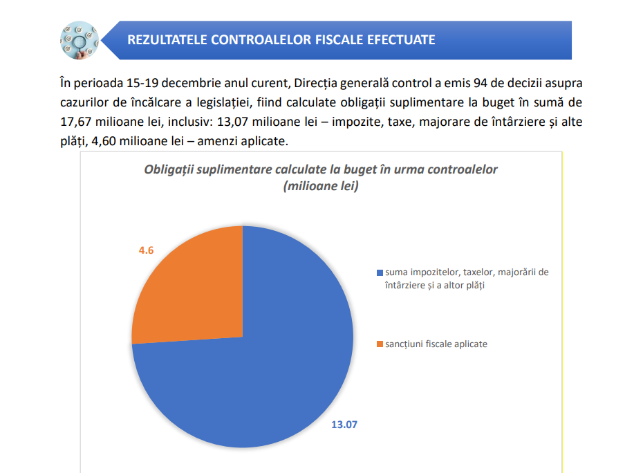 Tot în perioada de referință, potrivit SFS, Direcția generală control a emis 94 de decizii privind încălcări ale legislației fiscale constatate în luna noiembrie 2025. Ca urmare, au fost calculate obligații suplimentare la buget în sumă totală de 17,67 milioane de lei, acumulate din impozite, taxe, majorări de întârziere și amenzi.