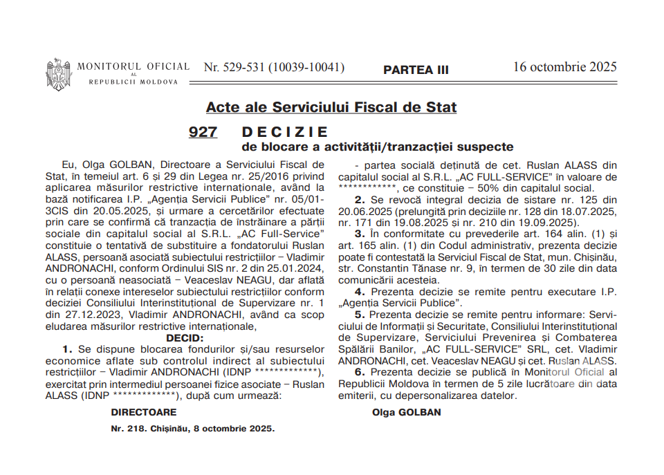 Potrivit documentului, decizia de blocare a fondurilor este aplicată „urmare a cercetărilor prin care se confirmă că tranzacția de înstrăinare a părții sociale din capitalul social al S.R.L. „AC Full-Service” constituie o tentativă de substituire a fondatorului Ruslan Alass, persoană asociată subiectului restricțiilor – Vladimir Andronachi, conform Ordinului SIS, cu o persoană neasociată – Veaceslav Neagu, dar aflată în relații conexe intereselor subiectului restricțiilor conform deciziei Consiliului Interinstituțional de Supervizare, Vladimir Andronachi, având ca scop eludarea măsurilor restrictive internaționale”.