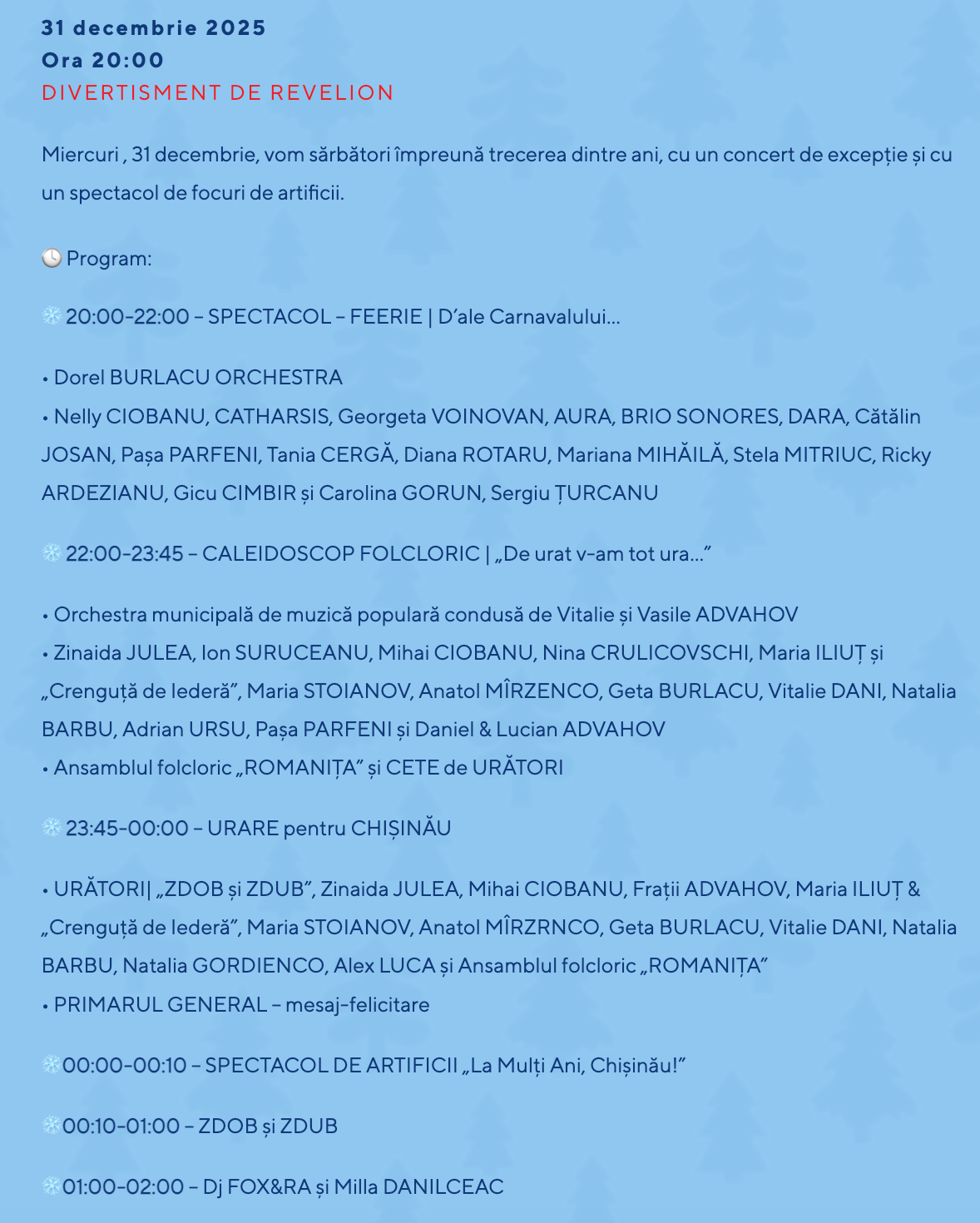 Chișinăul va întâmpina Anul Nou cu un amplu program artistic organizat pe 31 decembrie, începând cu ora 20:00. Evenimentul de Revelion include concerte live, momente folclorice, urături tradiționale și un spectacol de artificii de circa 10 minute la miezul nopții.