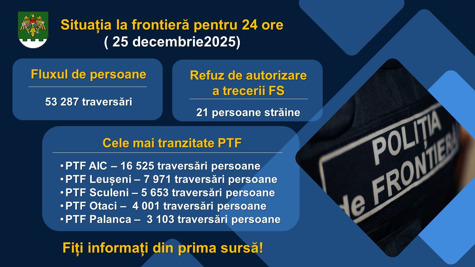 Fluxul de persoane la frontiera R. Moldova a crescut semnificativ de Crăciun. Potrivit datelor Poliției de Frontieră, în ultimele 24 de ore, au fost înregistrate peste 53 de mii de traversări ale frontierei. Fluxul sporit de călători este prognozat până la mijlocul lunii ianuarie.