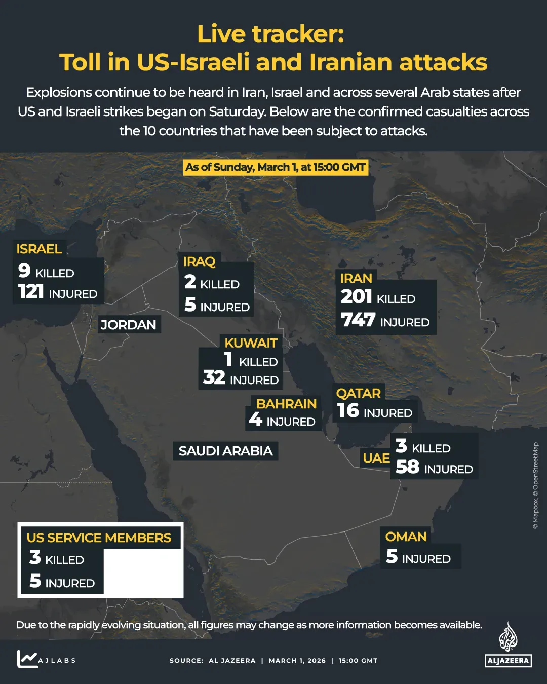 Potrivit rețelei globale de televiziune și media Al Jazeera, cu sediul la Doha, Qatar, de la începutul atacurilor asupra Iranului au fost ucise cel puțin 221 de persoane, iar aproximativ 988 au fost rănite.