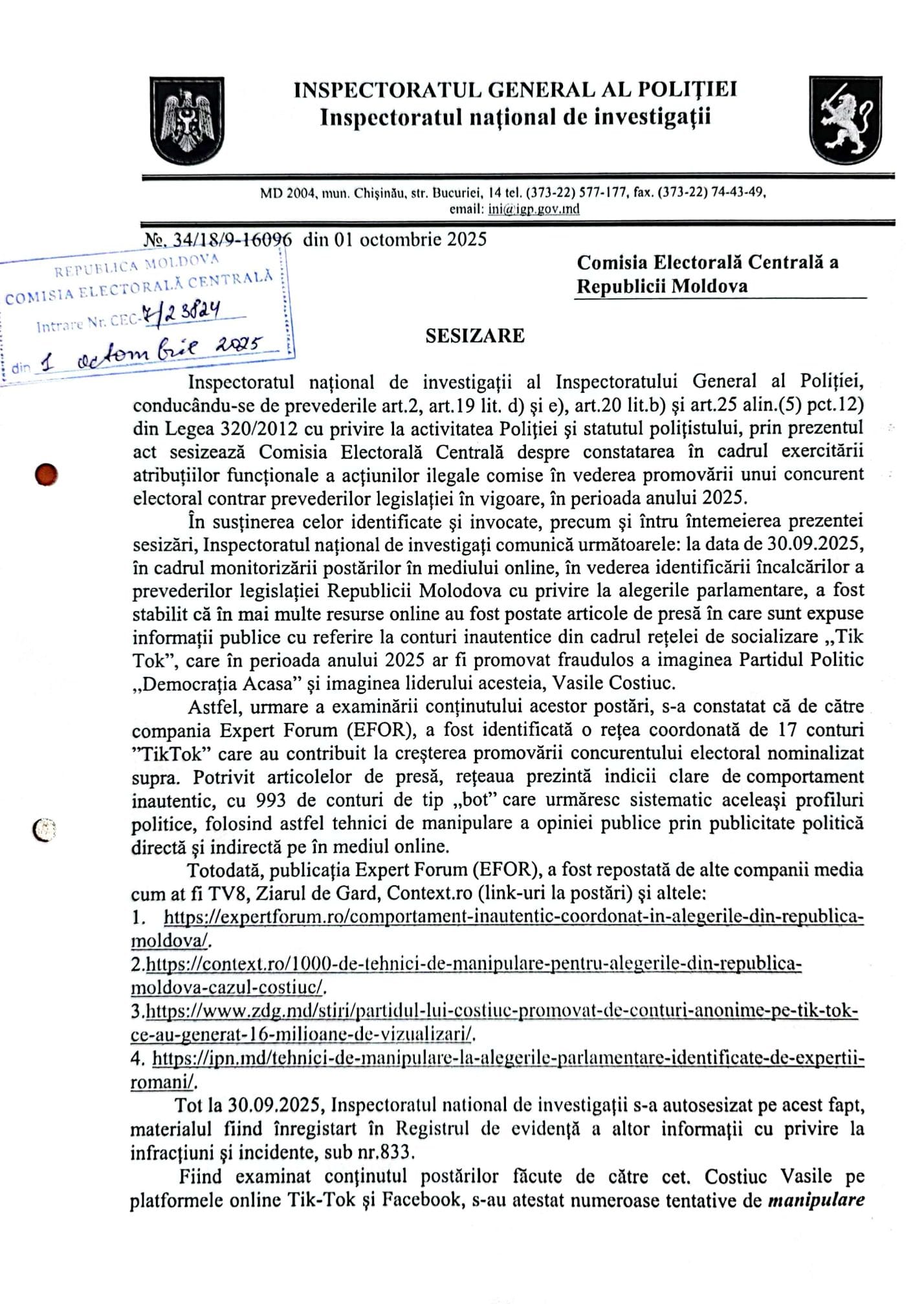 Inspectoratul Național de Investigații (INI) a transmis Comisiei Electorale Centrale (CEC) o sesizare privind presupuse încălcări comise de Partidul „Democrația Acasă” (PDA) în contextul alegerilor parlamentare. Despre acest lucru a anunțat liderul formațiunii, Vasile Costiuc, care susține că în baza documentului ar putea anulate voturile obținute de PDA la scrutinul din 28 septembrie.