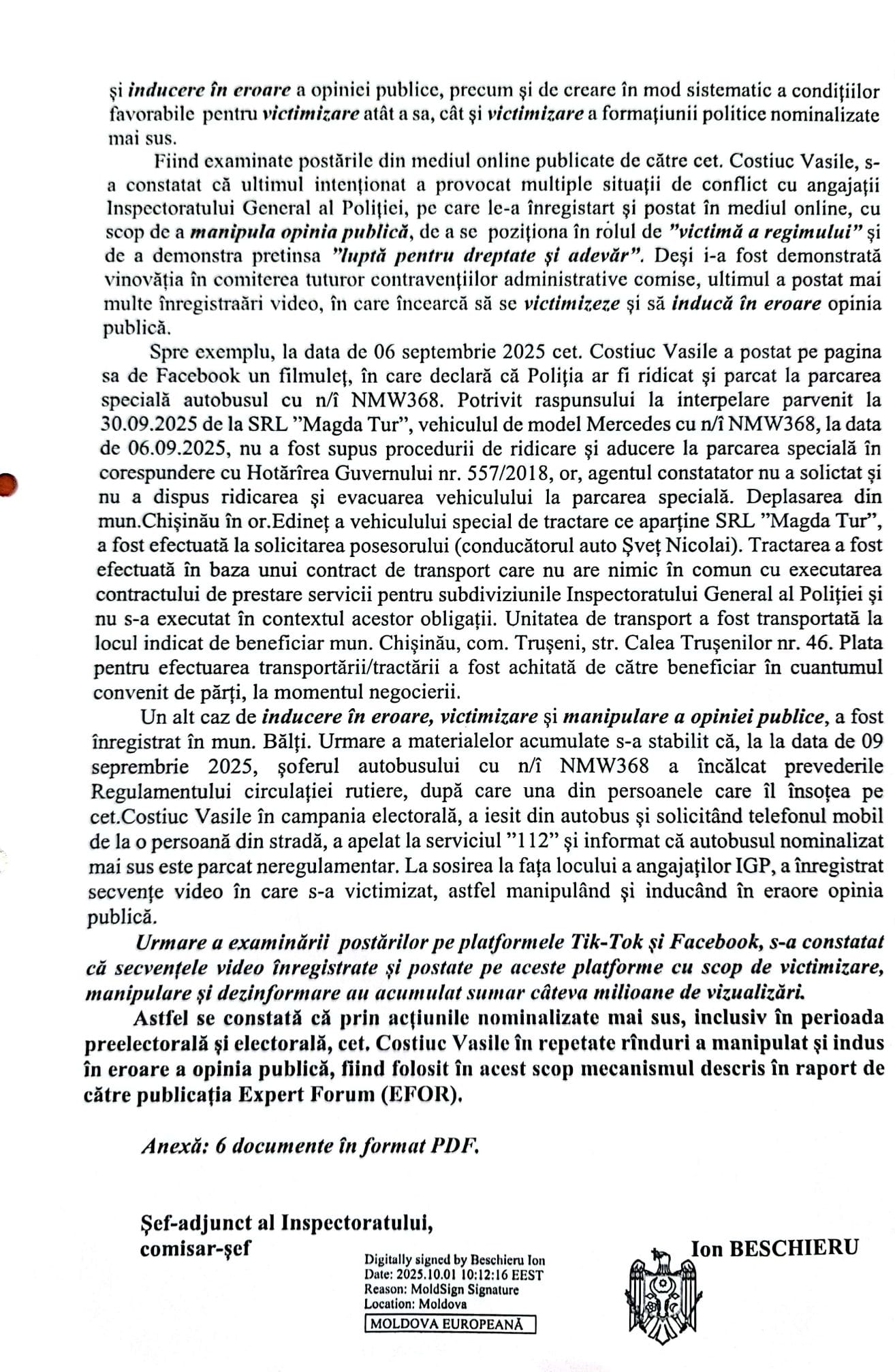 De asemenea, în sesizarea INI se menționează că Vasile Costiuc „a provocat intenționat multiple situații de conflict cu angajații Inspectoratului General al Poliției, pe care le-a înregistrat și postat în mediul online, cu scop de a manipula opinia publică, de a se poziționa în rolul de victimă a regimului și de a demonstra o pretinsă luptă pentru dreptate și adevăr”.