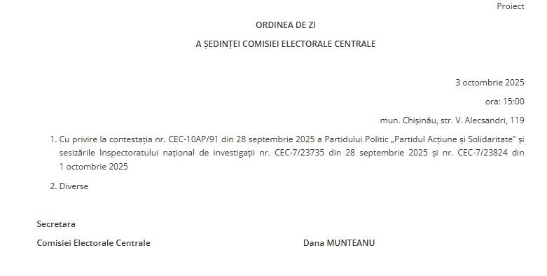 Menționăm că autoritatea electorală a publicat ordinea de zi pentru ședința din 3 noiembrie, unicul punct de pe agendă fiind examinarea unei contestații depuse de PAS și a mai sesizărilor Inspectoratului Național de investigații.