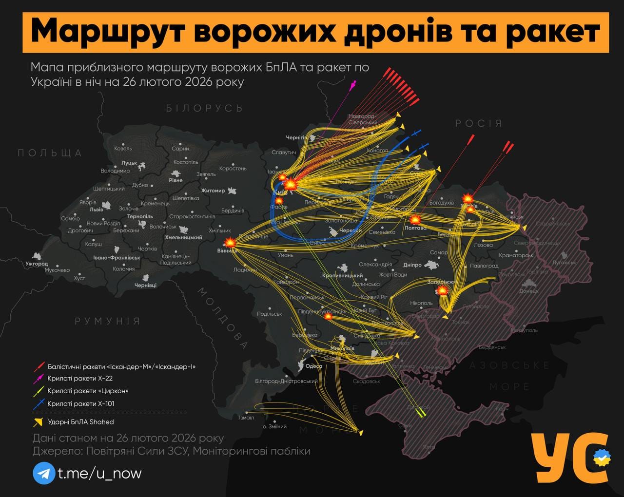 Ucraina a fost ținta unui nou atac aerian masiv în noaptea de 25 spre 26 februarie, după ce Federația Rusă a lansat un val combinat de rachete balistice, rachete de croazieră și drone de atac asupra mai multor regiuni ale țării. Explozii au fost raportate în capitala Kiev, precum și în estul și sudul Ucrainei, autoritățile confirmând victime, distrugeri ale infrastructurii civile și incendii în zone rezidențiale, transmite Kyivpost.com.