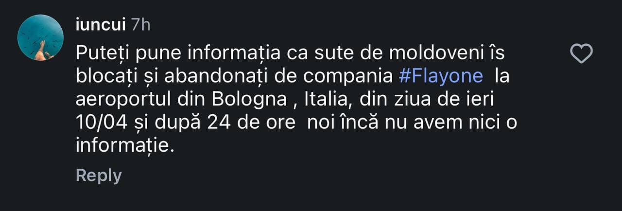 Potrivit pasagerilor, zborul este operat de Fly One. Inițial, compania aeriană i-a anunțat că zborul a fost amânat din cauza alertei cu bombă de la Aeroportul Internațional „Eugen Doga” Chișinău, care s-a dovedit a fi falsă. Ulterior, Fly One i-ar fi anunțat pe pasageri că avionul este defectat.