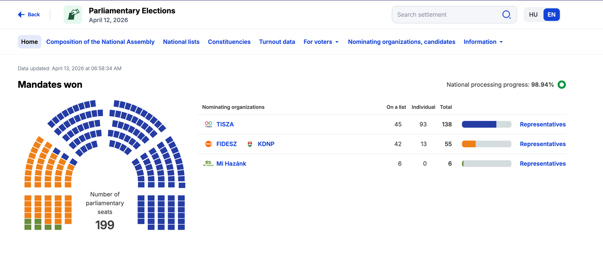 Potrivit datelor oficiale, cu peste 98% din voturi numărate, Tisza este pe cale să obțină 138 de mandate din totalul de 199, ceea ce îi oferă o majoritate calificată de două treimi în Parlament. În același timp, alianța Fidesz-KDNP, condusă de Orbán, ar urma să rămână cu aproximativ 55 de mandate, iar partidul de extremă dreapta Mi Hazánk Mozgalom - cu 6 mandate.