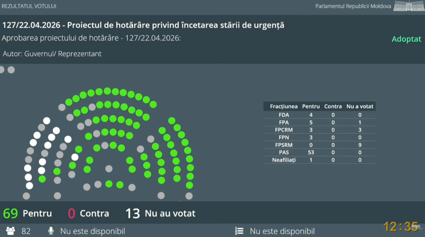 Parlamentul Republicii Moldova a adoptat astăzi, 24 aprilie 2026, proiectul de hotărâre numărul 127/22.04.2026 privind încetarea stării de urgență. Decizia a fost luată în cadrul ședinței plenare, după examinarea propunerii înaintate de către Guvern.