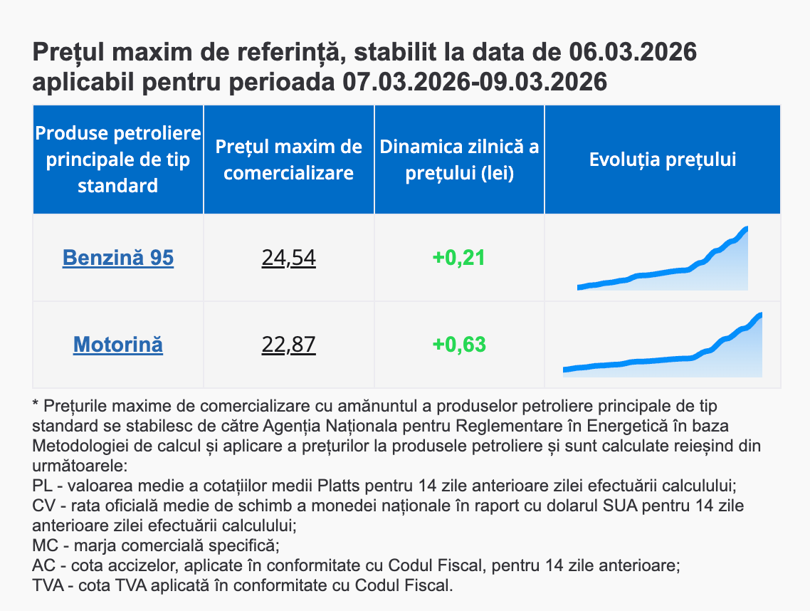 Potrivit ANRE, prețurile maxime de comercializare sunt calculate în baza unei formule care ia în considerare mai mulți factori, printre care cotațiile internaționale ale produselor petroliere (Platts), cursul de schimb al leului față de dolar, taxele aplicate și marja comercială.